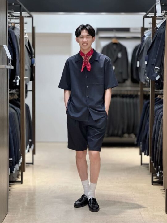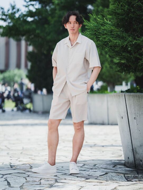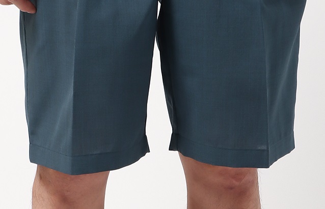 ハーフパンツは丈が長すぎるとトップスや足元とのバランスが取りにくく、短すぎると清潔さを感じにくいことから、程よく膝が見える丈に設計。裾幅は、座った時に窮屈さを感じない程度に絞ったほか、センターに折り目を入れることで、ハーフパンツながらも上品な印象に仕上げたという。生地は接触冷感素材を採用している。